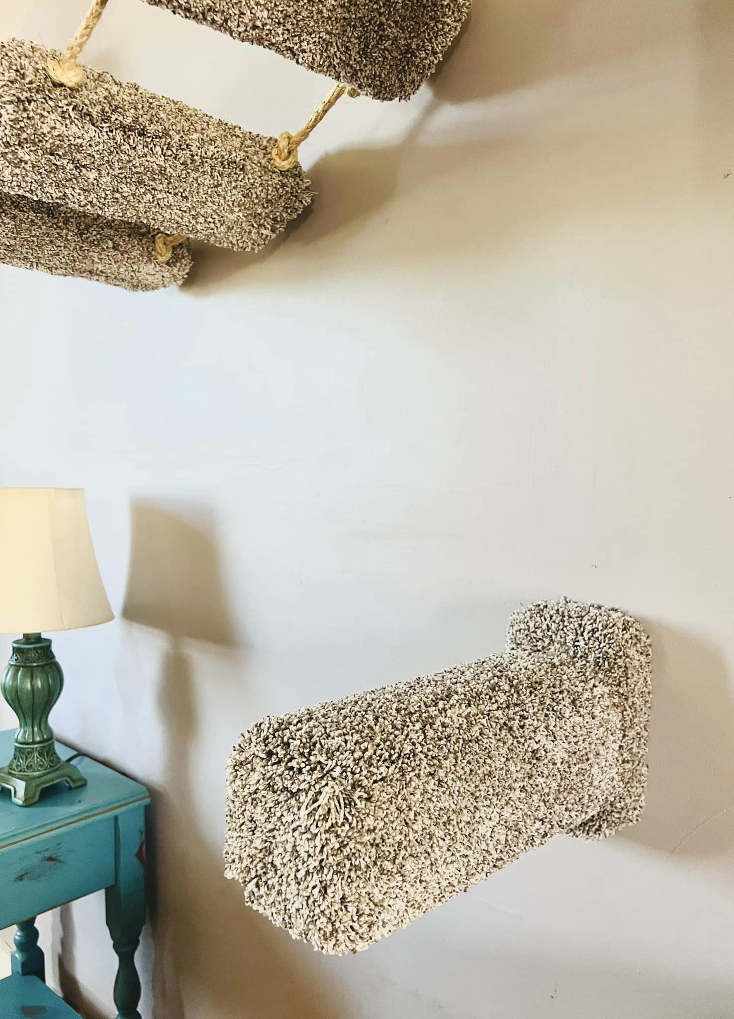 The kitty cloud peg is 3″x3.5″x12″ on a 3.5″x6″ wall-mounting plate. It is the simplest kitty cloud primarily meant as a stepping stone to other clouds on your wall. It comes with four preset screws to secure into a single wall stud.