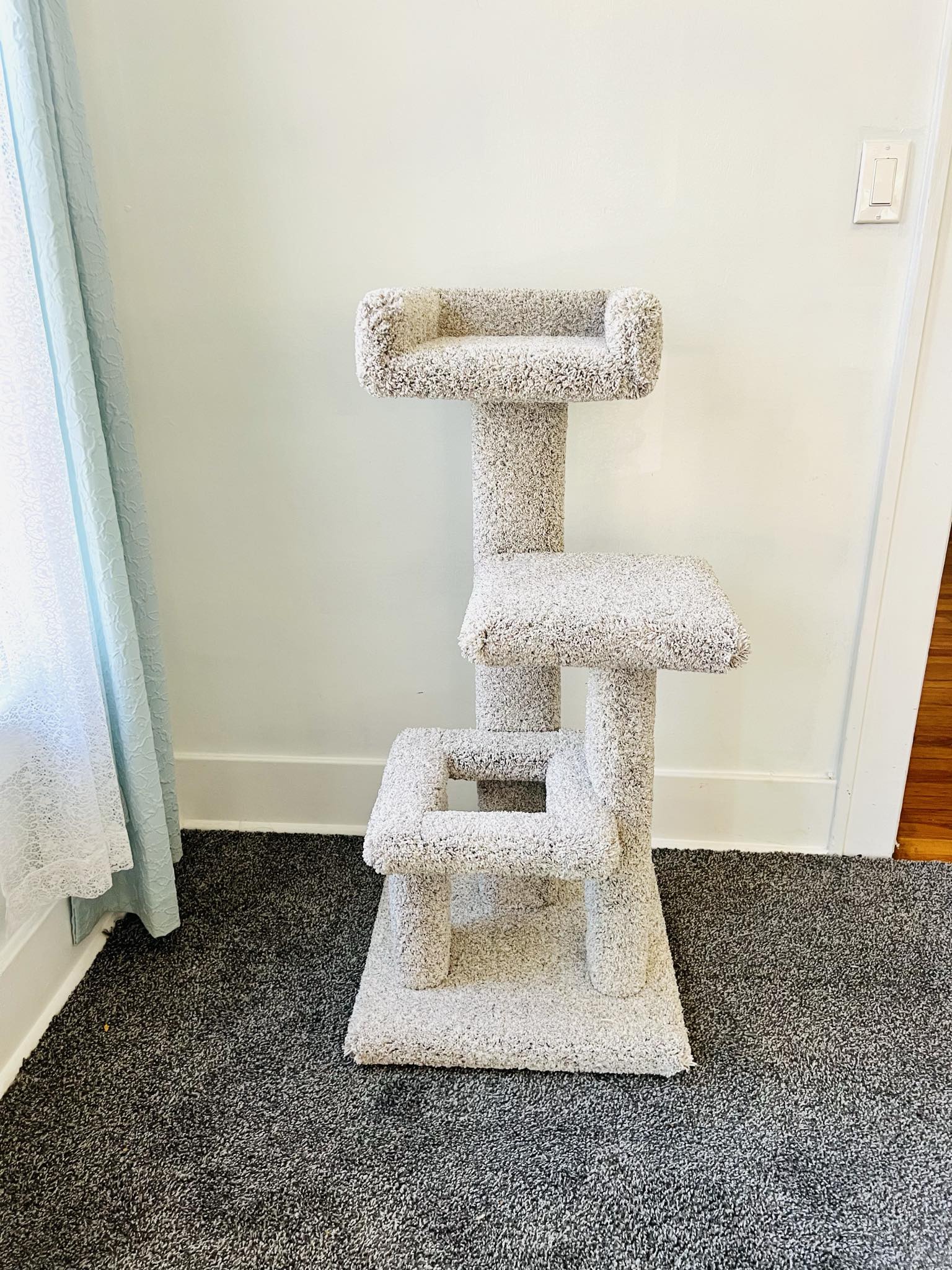 The Fruffy was named after our cat Fruffy who became the mother of Chloe and Nugget. It is 3.5 feet tall with an 18″x18″ base and features a platform, donut, and couch. Our best seller, this mid size kitty condo has plenty for exercise, sleep, and interactive play without using much floor space. Ideal for homes with one cat, the Fruffy is both beautiful and fun!
