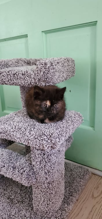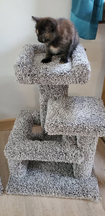 The Jellybean was named after our kitten Jellybean, seen in the picture. It is 22″ tall with a 15″x15″ base and features a kitten platform, a donut, and a kitten couch. This is the perfect model for kittens less than two months old. Ideal for catteries or kitten foster homes, the Jellybean has plenty for your kittens to play, sleep, and exercise on at safe heights!