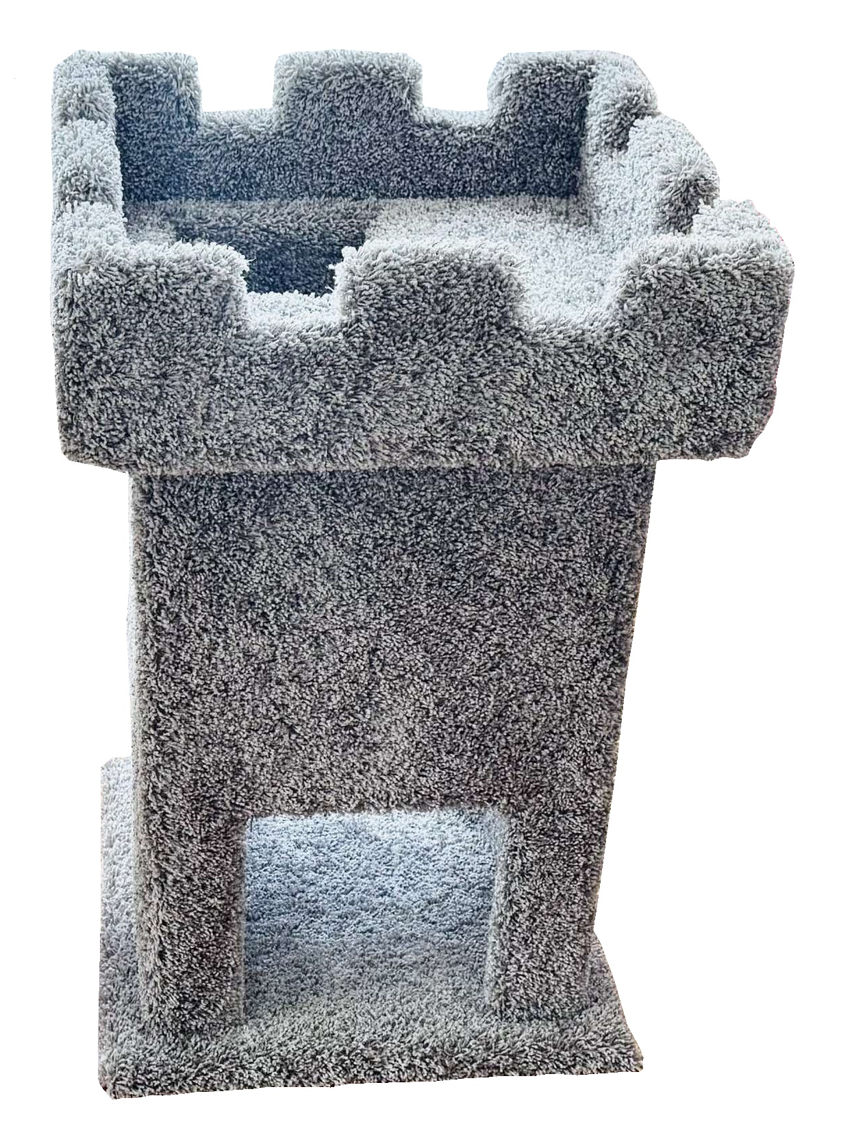 The King Snow was named after our Bengal cat whose full name is “Snow: King of the Castles.” This super cool castle was made for those who know that every cat deserves a castle but don’t have very much floorspace. It is 2’8″ tall with an 18″x18″ base and features a 2′ tower with 4 doorways and 1 interior platform that leads to the top 18″ rampart couch with total width and length being 19.5″x19.5″. This small fortress of a kitty condo is perfect next to a couch or in front of a window for daydreaming about catching birds. Ideal for homes with 1-3 cats, the King Snow is a lordly masterpiece for you and your cats!