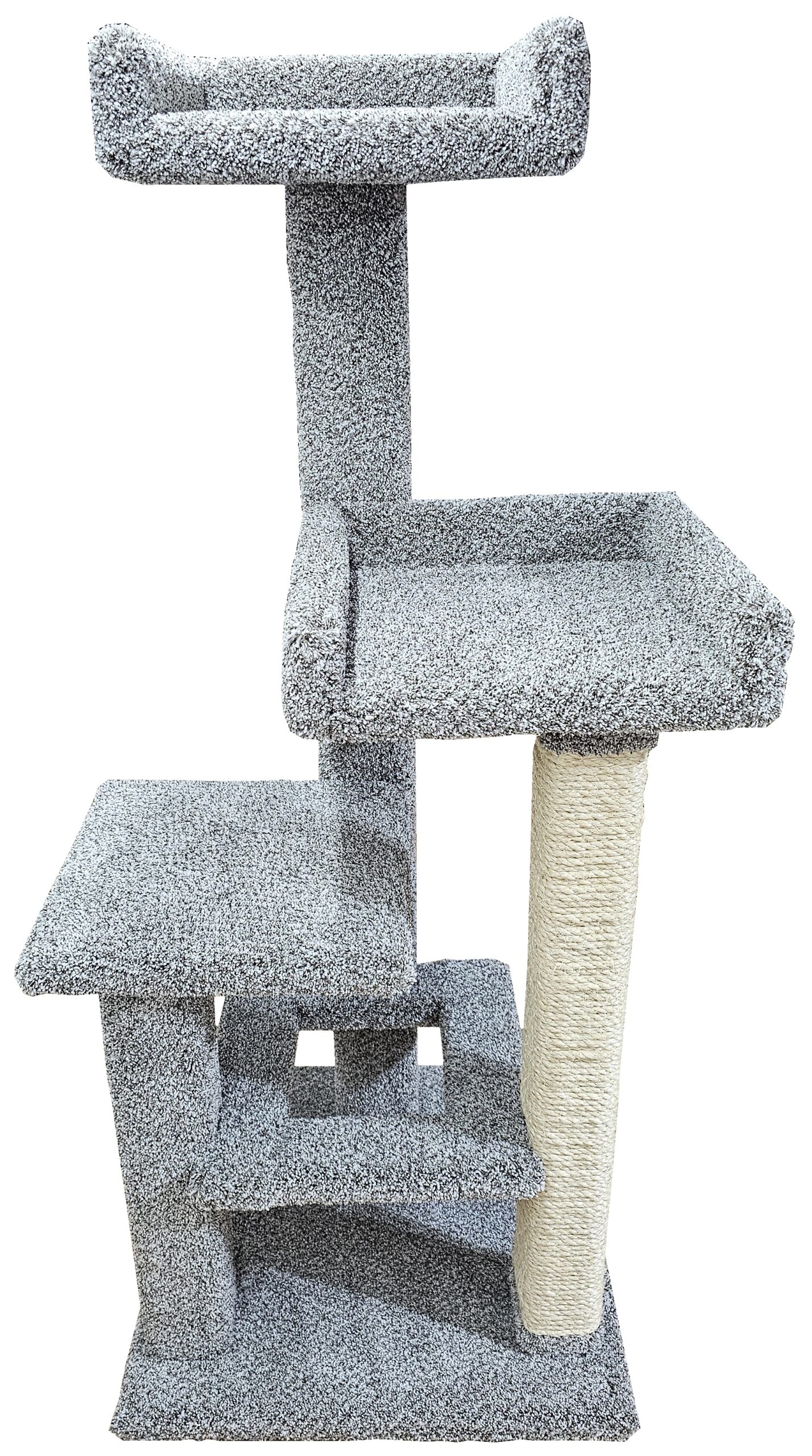 The Odie+ is the plus sized take on the Odie, named after an office cat from one of our pet stores. It’s the same basic design, but all the landings are enlarged from 12″x12″ to 15″x15″; all posts are doubled, and the 3′ post is tightly wrapped in sisal rope. Whether you have Maine Coons, Norwegian Forest Cats, plain ol’ fat cats, or just multiple normal cats who like to snuggle, the Odie+ is a great option!