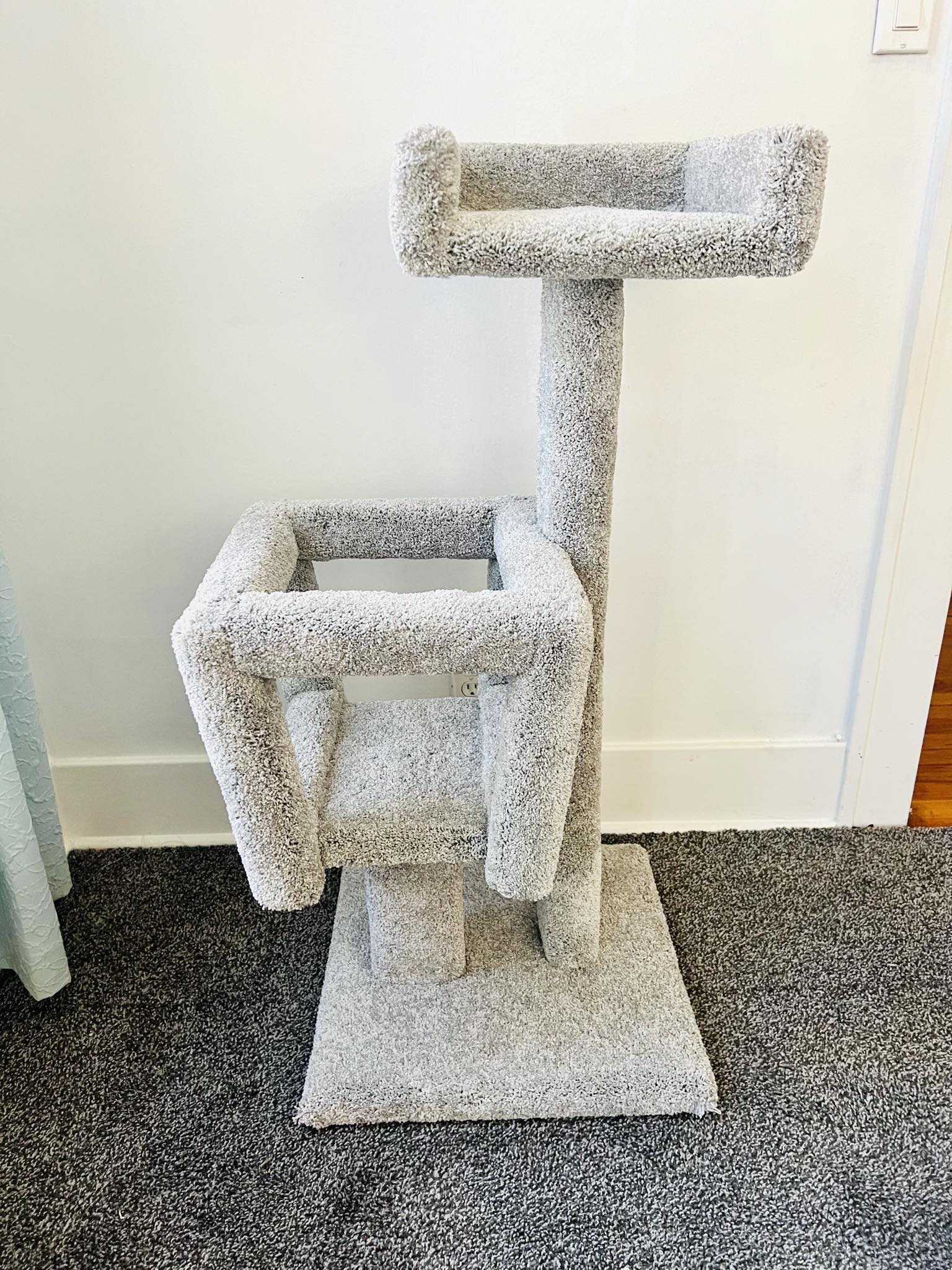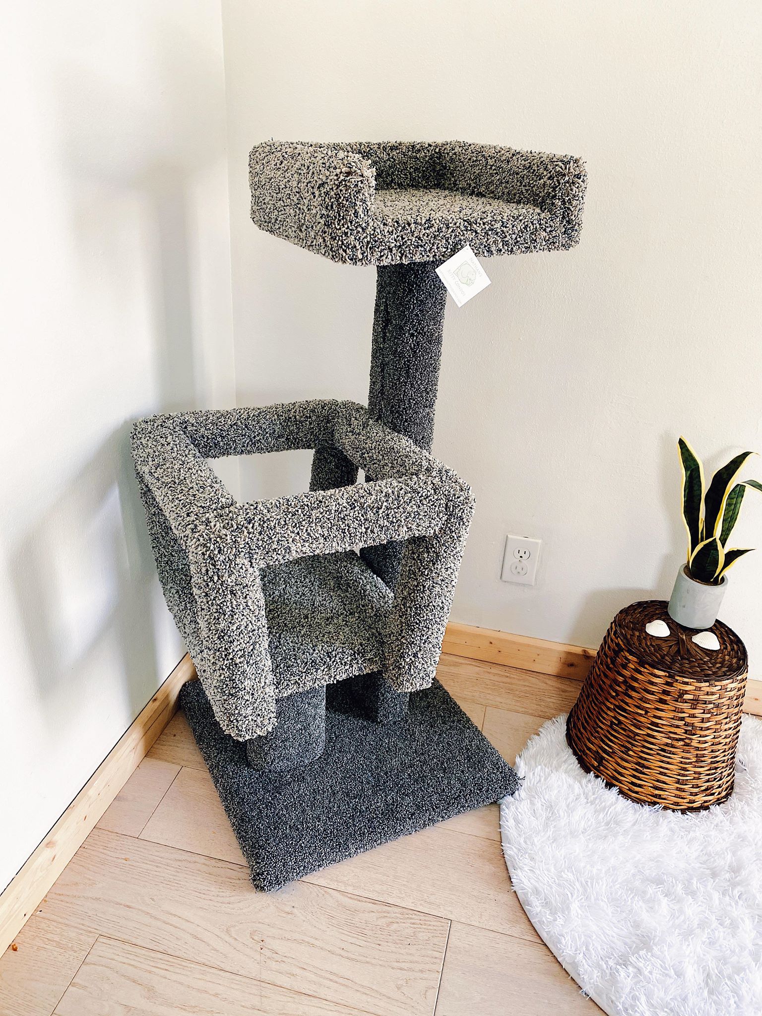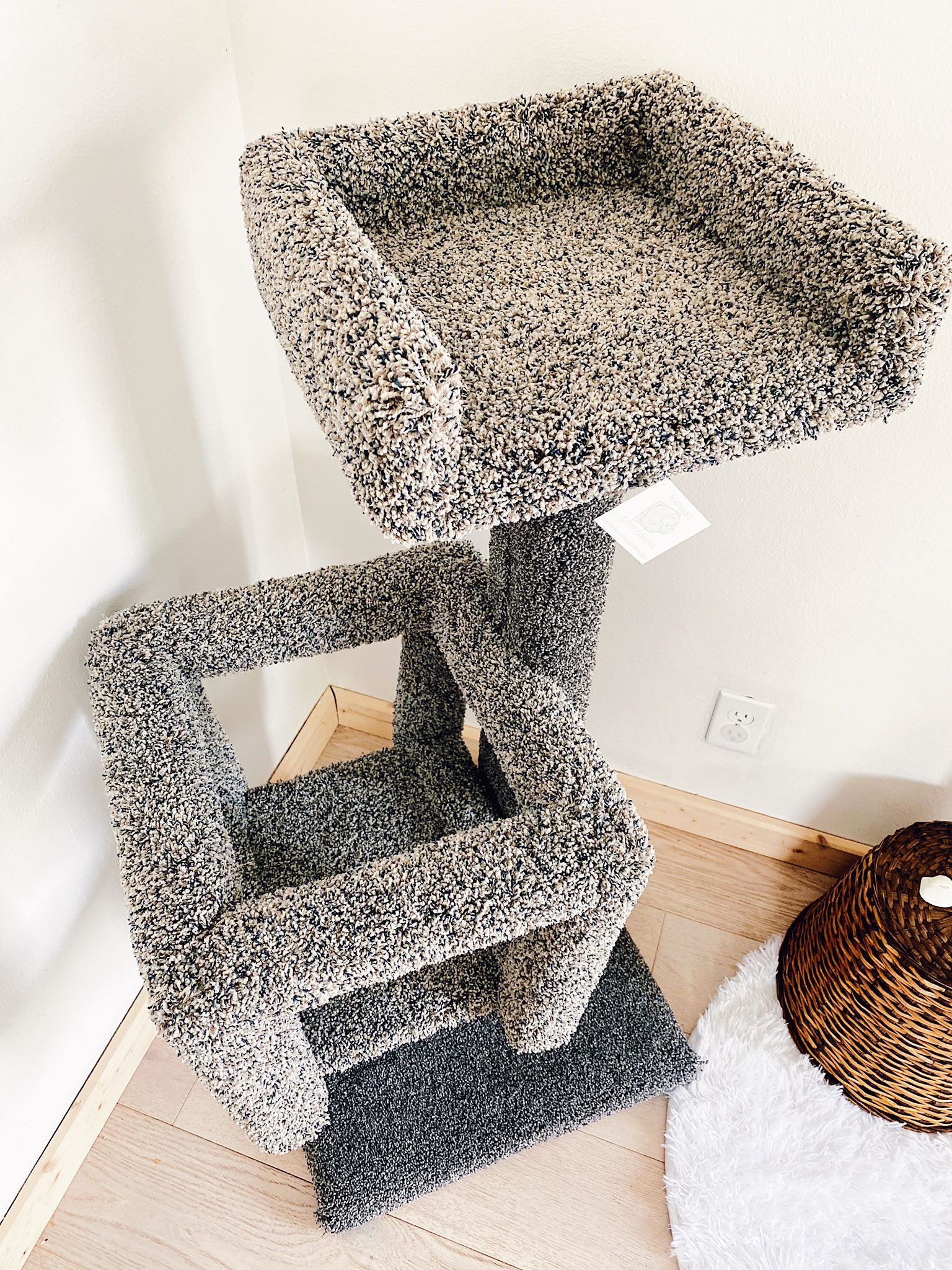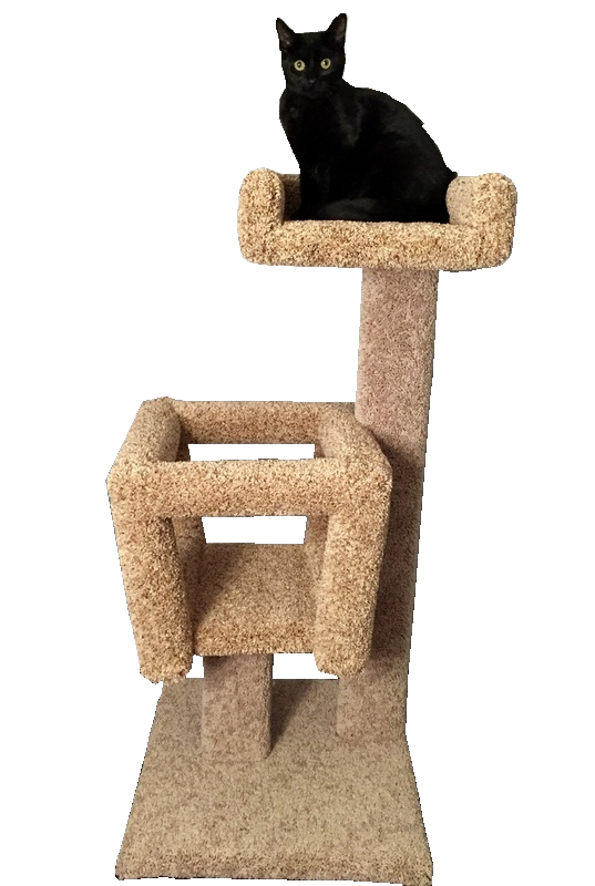 The Tiny was named after our cat Tiny, seen in the picture. Her actual name was Valentine since she was a Valentine’s present for Grace, but Tiny for short! It is 3.5 feet tall with an 18″x18″ base and features a cube and a couch. This mid size kitty condo has plenty for exercise, sleep, and interactive play without using much floor space. Ideal for homes with one or two cats, the Tiny is both beautiful and fun!